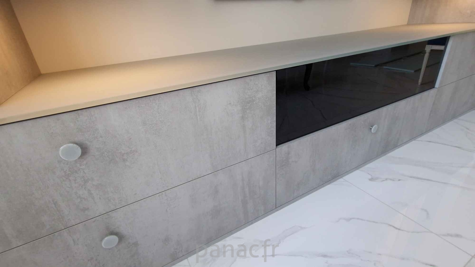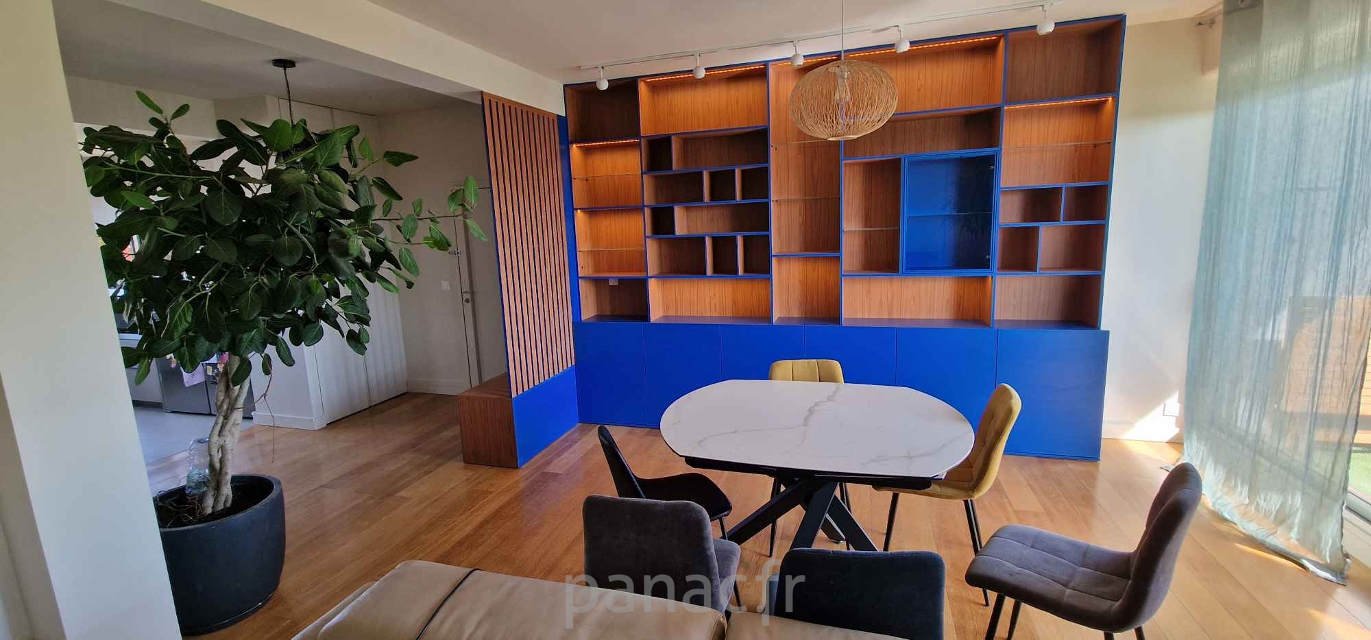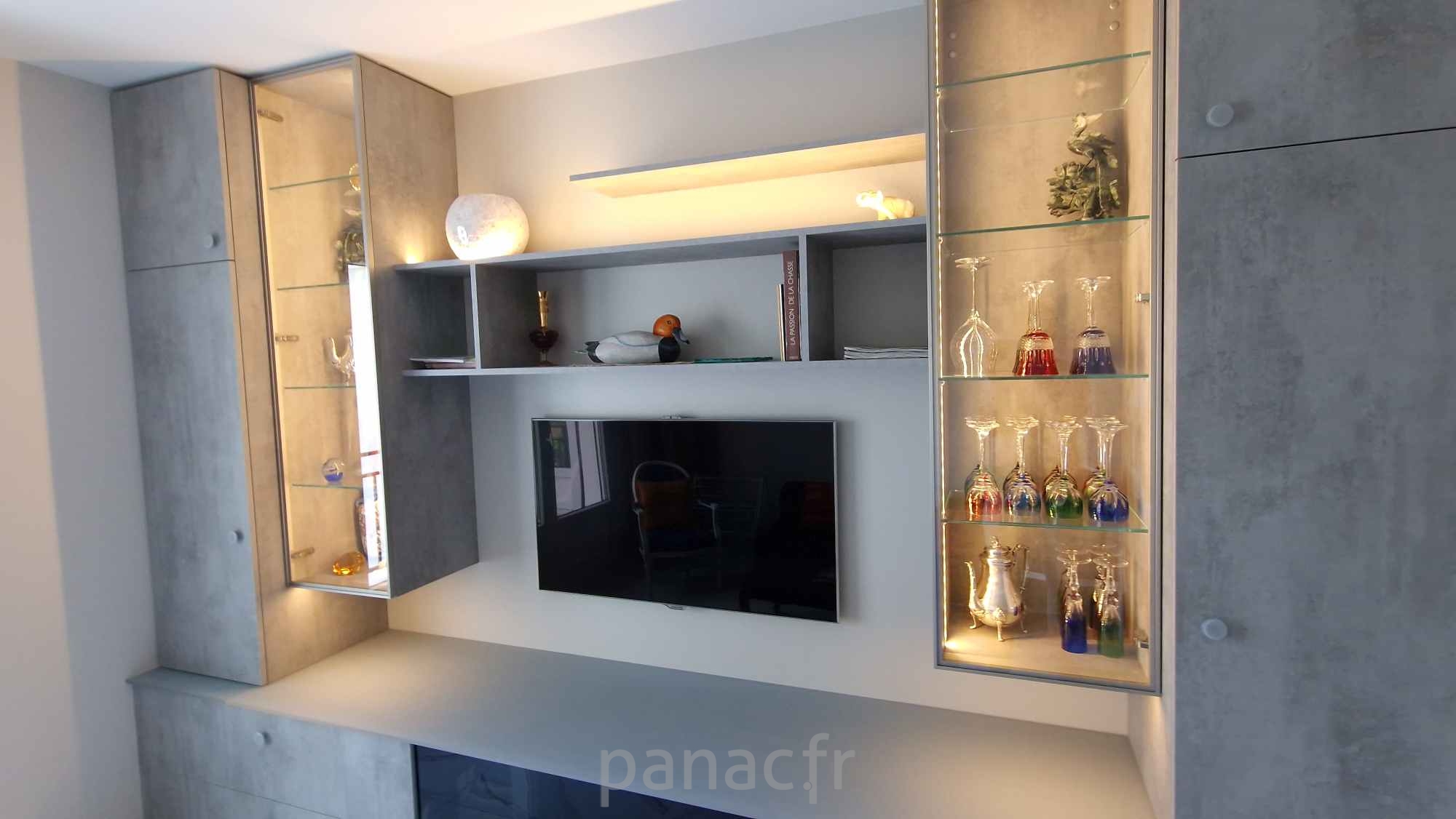 création d’un espace mixte bibliothèque / meuble TV / rangement.