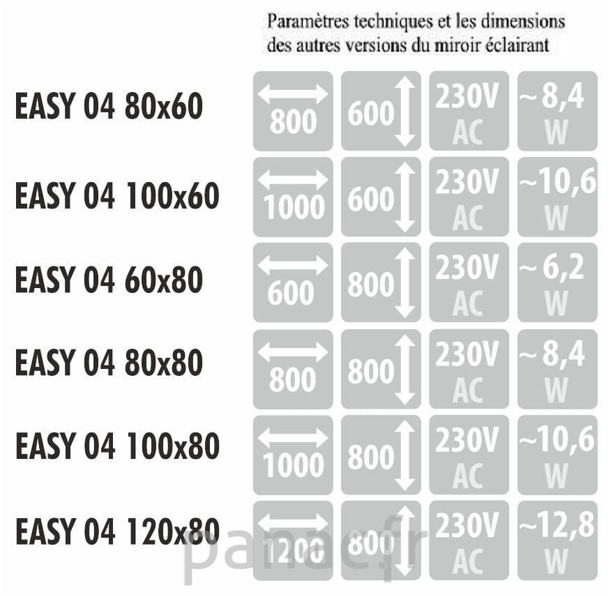 fonctions supplémentaires disponibles sur demande: miroir grossissant, système anti-buée, interrupteur sensitif, etc.