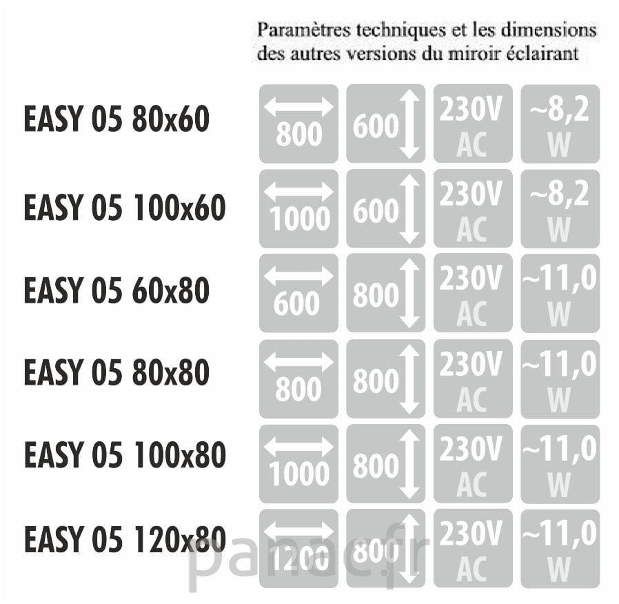 fonctions supplémentaires disponibles sur demande: miroir grossissant, système anti-buée, interrupteur sensitif, etc.